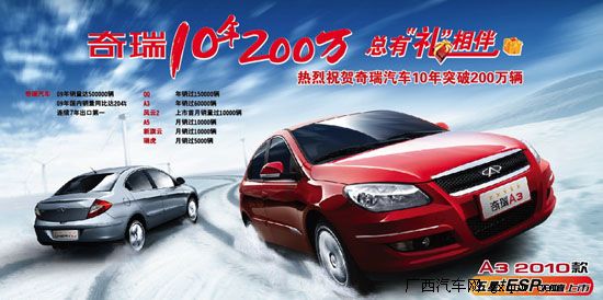 對于奇瑞汽車而言,2010年無疑稱得上是一個瑞年。1月尚未過完,奇瑞就已率先迎來了雙喜臨門。一方面,奇瑞汽車在10年間累銷突破200萬,進(jìn)一步樹立了自身的市場地位。另一方面,品質(zhì)轉(zhuǎn)型作A3 在改款后的首月便突破銷量記錄,邁入了上市以后的全新高度。