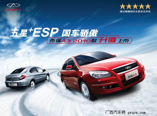 早在09款上市之時,奇瑞A3便率先引入了這一配置,成為當時十萬元內(nèi)唯一配備有ESP的車型。一年的時間中,ESP的風潮愈演愈烈,得到了業(yè)內(nèi)外更多人士的關(guān)注,F(xiàn)今,2010款A(yù)3進一步采用了全系標配ESP的配置水平,再度成為十萬元以下家轎中唯一全系標配ESP的車型,先后兩次開創(chuàng)了國內(nèi)緊湊型家用車市中的安全先河。