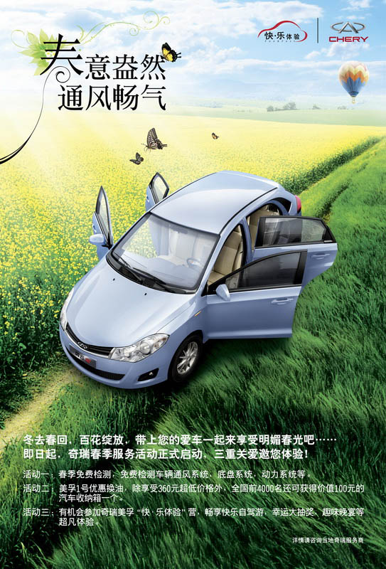 冬去春回,百花綻放,正值萬物復(fù)蘇之際,奇瑞公司啟動(dòng)了2010年“快•樂體驗(yàn)”服務(wù)品牌春季關(guān)愛活動(dòng)。據(jù)悉,此次活動(dòng)以“春意盎然 通風(fēng)暢氣”為主題,旨在以服務(wù)送清爽,為用戶營(yíng)造春季清新舒暢的駕車體驗(yàn)。
