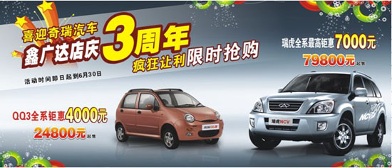 即日起到6月底,為慶祝廣西鑫廣達奇瑞店慶3周年,QQ3全系鉅惠4000元,24800元起售,又一次刷新了中國小車的低價記錄,瘋狂搶購正式開始了!
