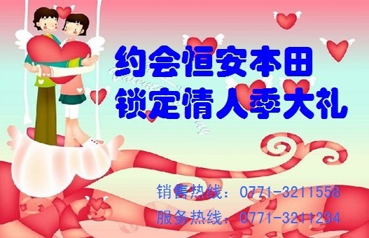 恒安本田精心為您準(zhǔn)備了節(jié)慶促銷大禮包。與最愛的人一起盡情享受浪漫情人節(jié)帶來的浪漫情懷。我們的宗旨就是讓每一位節(jié)日期間到店的顧客都充分感受到節(jié)日的濃郁氣氛: