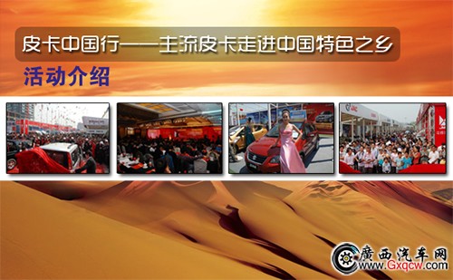 皮卡中國行——主流皮卡走進中國特色之鄉(xiāng)是由中國皮卡網(wǎng)在2012年將推出的最強皮卡文化營銷活動。中國皮卡網(wǎng)將攜國內一線主流皮卡品牌走進全國4大皮卡重點市場、16縣市、300鄉(xiāng)鎮(zhèn),實現(xiàn)皮卡行業(yè)史上首次偉大的營銷創(chuàng)舉。同時還將舉辦中國皮卡年度車型評選及2012中國皮卡行業(yè)發(fā)展論壇等大型活動。中國皮卡網(wǎng)將憑借這一系列重磅品牌營銷活動領銜2012皮卡行業(yè)強勢開局!