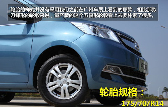 輪轂的樣子并沒有采用我們之前在廣州車展看到的那款七幅旋風型的設計,而是采用了相對樸素的五幅造型,雖然設計簡單了型,但還是比較美觀的,而歐力威的這次量產(chǎn)車型的輪胎規(guī)格為175/70/R14。