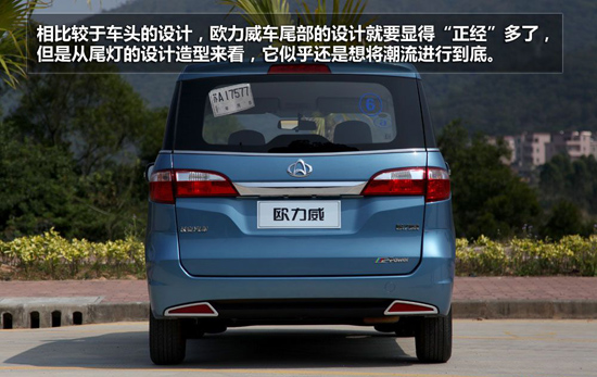 而尾部的造型則是最突出它風格的地方,垂直的D柱讓它看起來更有味道,而相比較起市面上其他類似的車型來看,歐力威的樣子無疑具有更大的吸引力。配合上部分鍍鉻裝飾的襯托,絕對讓它能有一種超凡脫俗的感覺。不過如果尾燈的造型能夠像頭燈一樣更加有精神的話,效果肯定會更好。
