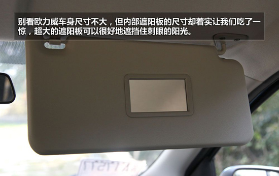 遮陽板的尺寸是這會比較讓我意外的一個地方,這樣打的遮陽板是我們在平常的車型上很難見到的,從此可以看出長安這次在歐力威的身上并沒有偷工減料的行為。