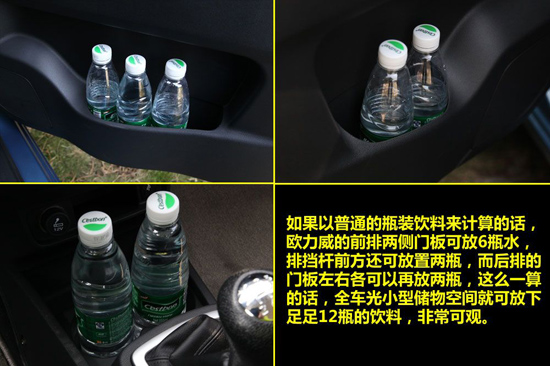 儲(chǔ)物空間方面,杯架的數(shù)量之多不僅讓人感嘆,前排杯架數(shù)量共有八個(gè),兩側(cè)門板各能放置三瓶,而中控下方還有兩個(gè)標(biāo)準(zhǔn)的杯架槽,并且在它的前方還有一個(gè)可以放置雜物的小型儲(chǔ)物格。而后排同樣兩側(cè)門板也各能放置兩個(gè)瓶子,這樣一來整車車內(nèi)共可放置12個(gè)水瓶,所以如果您正坐在歐力威里去跑長(zhǎng)途的話,只要前期準(zhǔn)備充分,絕對(duì)是不會(huì)出現(xiàn)缺水現(xiàn)象的。