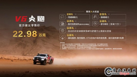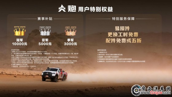 9月,賽級皮卡V6火炮正式上市,官方建議零售價22.98萬元,并同步推出15000元置換禮、5000元老友禮等六大權(quán)益。為滿足廣大用戶的需求和呼聲,凡駕駛V6火炮參加規(guī)模超過100臺賽車的政府舉辦的賽事,將給予冠亞季軍3000-10000元賽事補(bǔ)貼;同時,為降低車友玩車成本,針對火炮首任車主,一年內(nèi)因越野、玩沙場景損壞更換的易損件,更換工時免費,部分配件按市場指導(dǎo)價免費或五折提供。