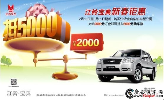 為進一步控制機動車排氣污染,改善城市環(huán)境空氣質(zhì)量,實施國三切換國四政策,江鈴皮卡動力水平、節(jié)油水平、排放水平等全面突破。并全面實現(xiàn)將排放提升到歐Ⅳ水平。截止至4月30日推出超值優(yōu)惠政策,購江鈴寶典皮卡預(yù)交2000元訂金抵5000元購車款優(yōu)惠活動。限時搶購,不要猶豫,馬上到店選購吧!