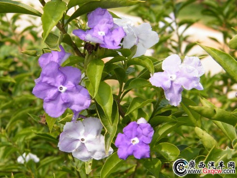 “番茉莉”又名鴛鴦茉莉、雙色茉莉。開花時可同時看見白,紫二色花朵共存,且花朵於夜間會散發(fā)香氣。因其為外來引入且花香如茉莉般之意;又因其花初開時為紫色,且花香于夜間最濃,故又名(紫葉香花)。其*大的特色是其花朵開放的過程中會變顏色,每朵花由初開時的深紫色,漸變?yōu)闇\紫色,或粉紅色,在轉變?yōu)榘咨。因此就好像同一植株上開滿了不同顏色的花朵一般,所以又叫做“變色茉莉”或“五彩茉莉”。