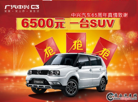 一等獎只需6500元就可將廣汽中興C3廠慶版開回家!25-27日,每天10:00-11:00,20:00-21:00,與您相約搶車!
