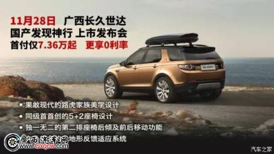 11月28日,廣西長(zhǎng)久世達(dá)捷豹路虎誠(chéng)邀您參與全能全地形豪華SUV路虎發(fā)現(xiàn)神行上市發(fā)布會(huì),首付7.36萬(wàn)起,金融按揭可節(jié)省4.7萬(wàn)元,捷豹路虎輕松開(kāi)回家!詳詢廣西長(zhǎng)久世達(dá)捷豹路虎,0771-3361111 ,南寧南站大道9號(hào)。