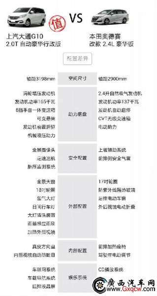 從兩者的配置對比結果來看:上汽大通G10的配置要豐富很多,除了軸距和動力的優(yōu)勢外,還多出了全景攝像頭、定速巡航、胎壓監(jiān)測等安全配置,同時全 景天窗、氙氣大燈、車聯(lián)網(wǎng)、車載導航、后排液晶屏也有配備;再看看奧德sai,多出上坡輔助,前排側安全氣囊及加熱座椅,配置略顯寒酸。
